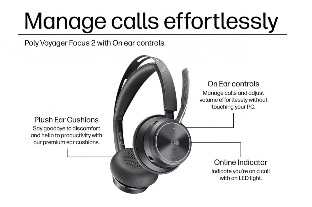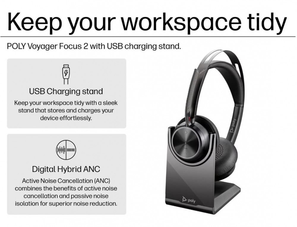 Poly Voyager Focus 2 MS Teams Certified USB-C-C Headset +USB-C/A Adapter +Charging Stand 9T9J6AA#AC3
